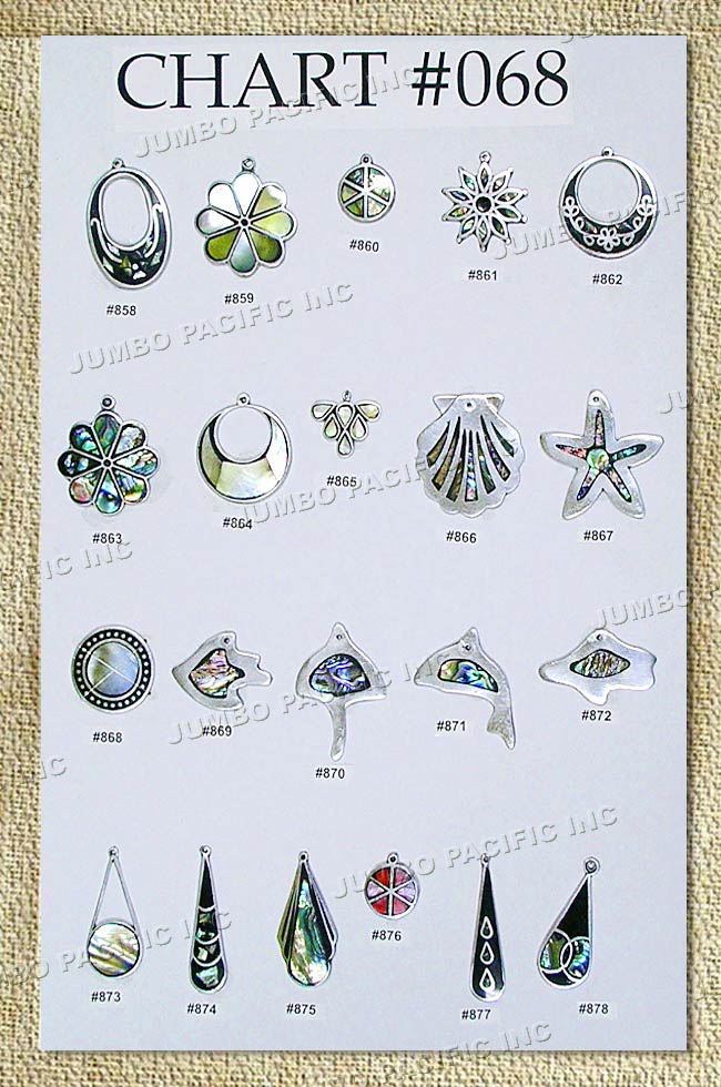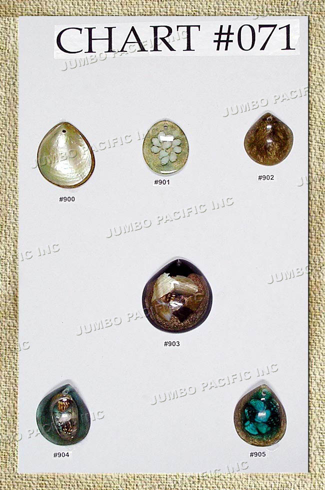 Assorted shell pendants in pastel colors.