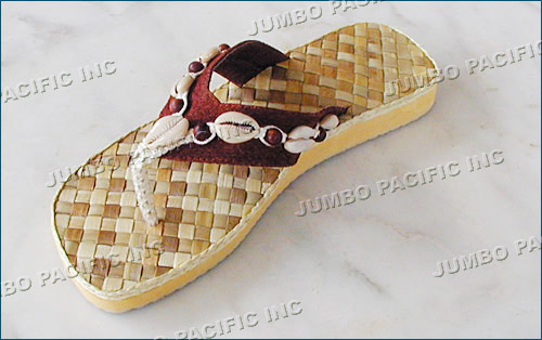 Desc.: Pandan slipper with brown leather strap and breaded pamo thread and cut-sigay shell.
